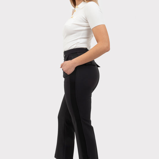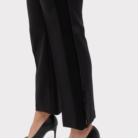 Crepe tuxedo trousers with shiny satin side bands. Vent at the end and 2 buttons.