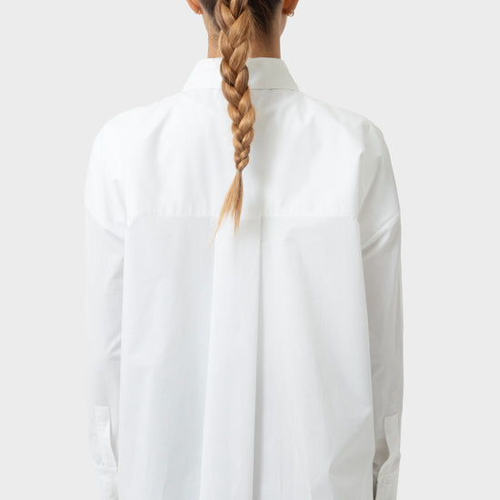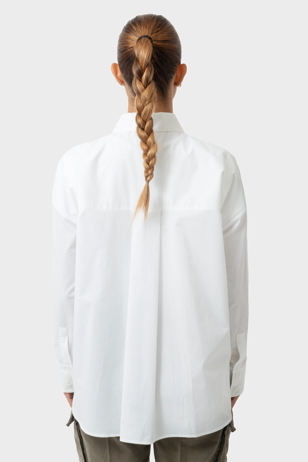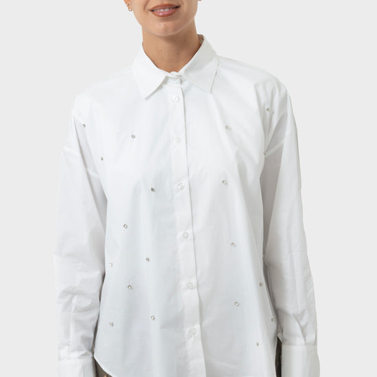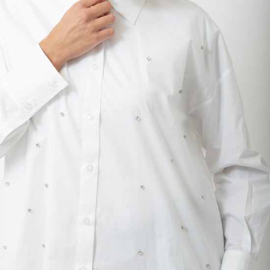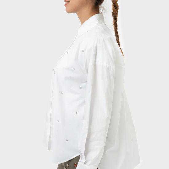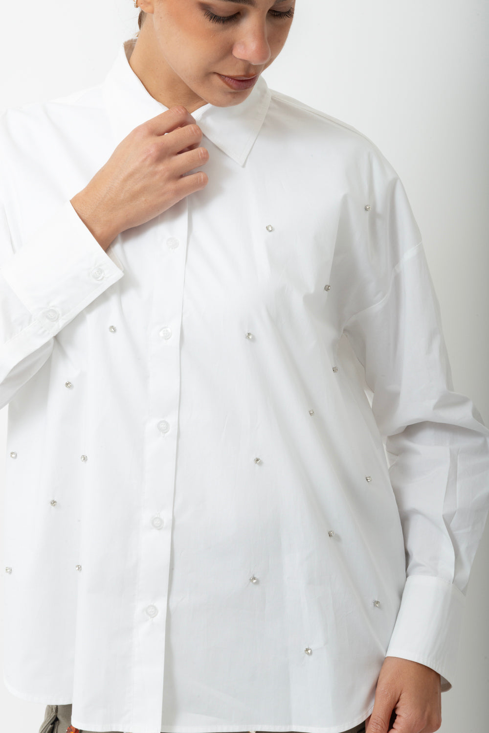 Camicia over, manica lunga, con pietre applicate sul fronte.