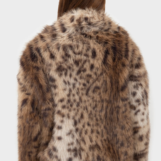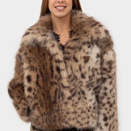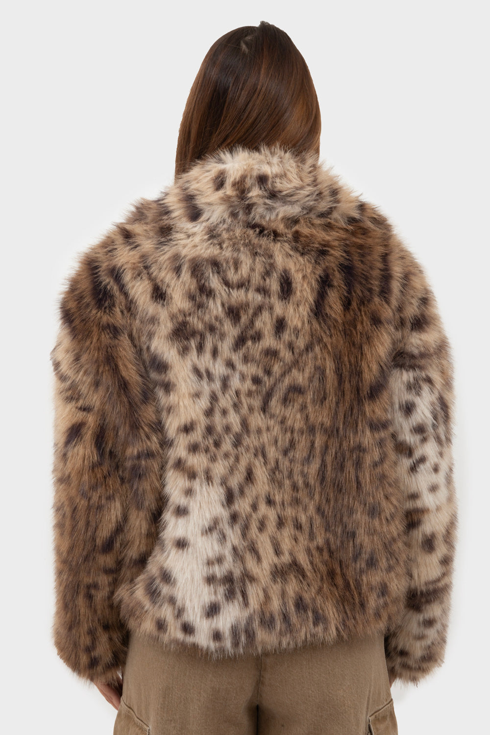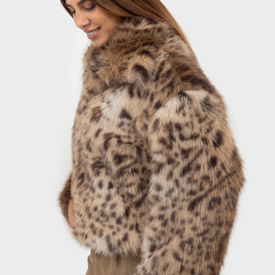 Ecopelliccia corta maculata con chiusura ad un gancio e tasche america.