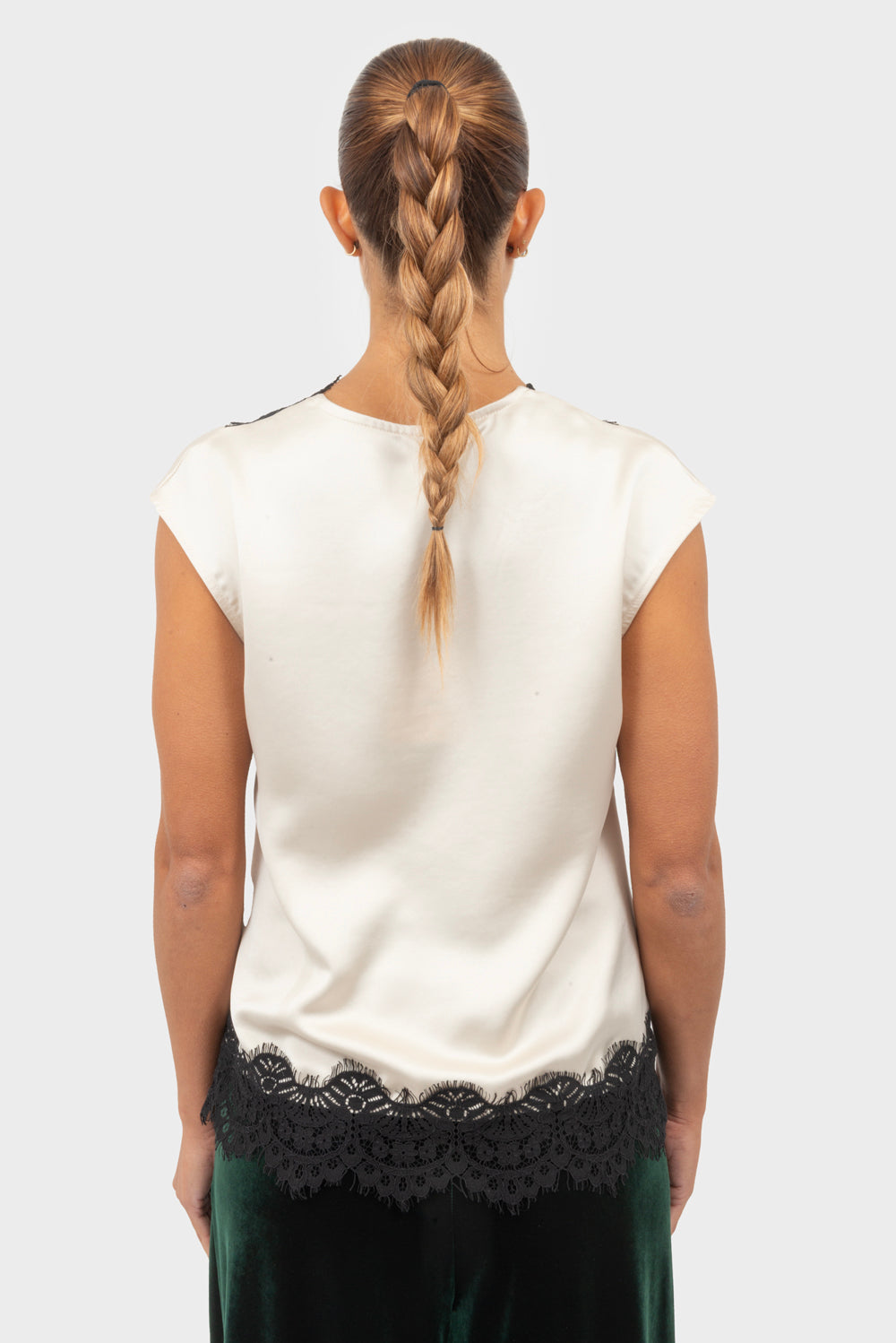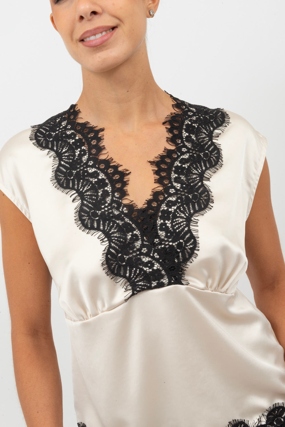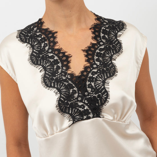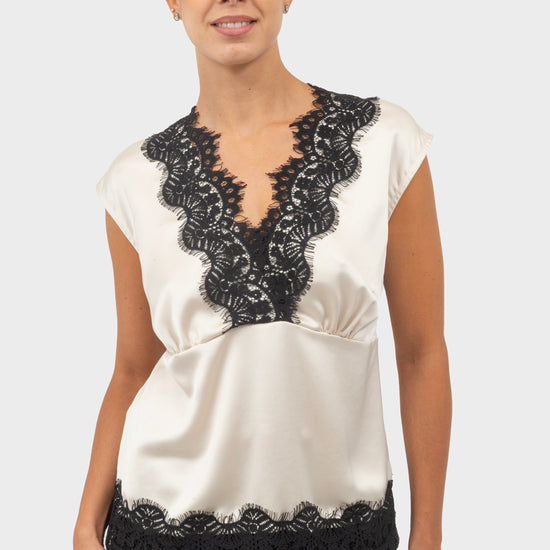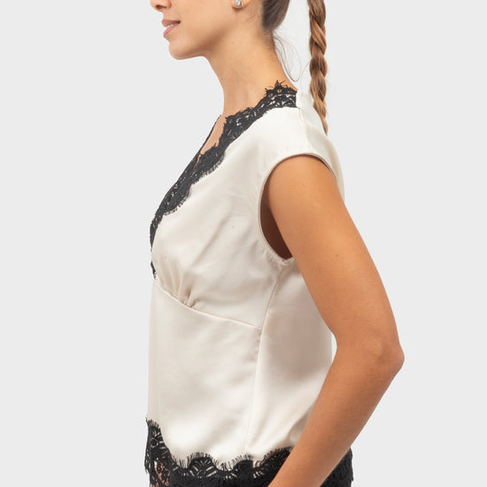 Top con orli in pizzo e scollo a V.